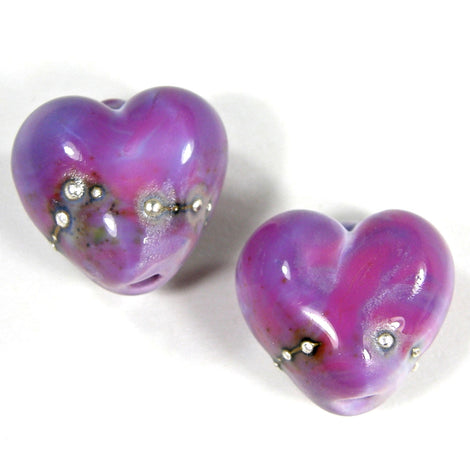 Handmade Lampwork Glass Heart Beads, Premium Purple Wrapped in Fine Silver