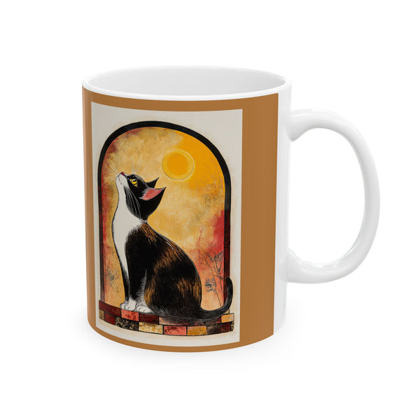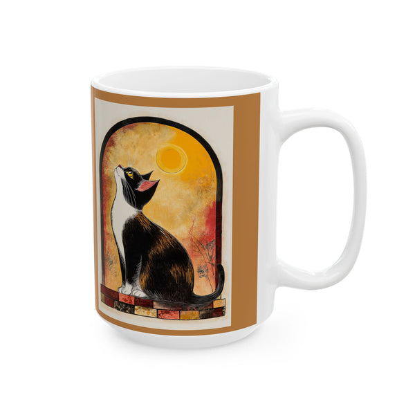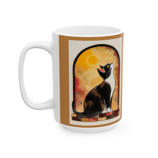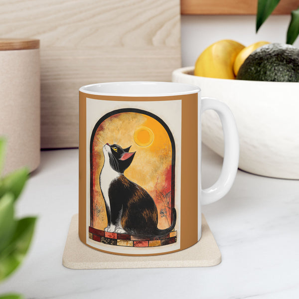 Vibrant Artistic Ceramic Mug - Unique Coffee Cup, Gift for Art Lovers, featuring cat and moon art print. This mug brings a creative and mystical atmosphere to your morning coffee routine. Perfect for cat lovers and art enthusiasts, this mug is a great gift for birthdays, holidays, or special occasions.
