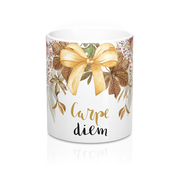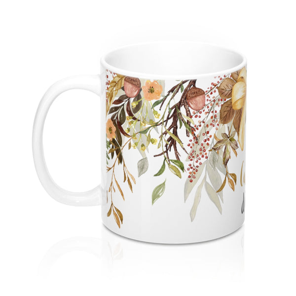 Seize the day! That's what coffee does for you, and this mug is soothing like a good morning blend. A lot of earth tones make up this bouquet of autumn flowers.