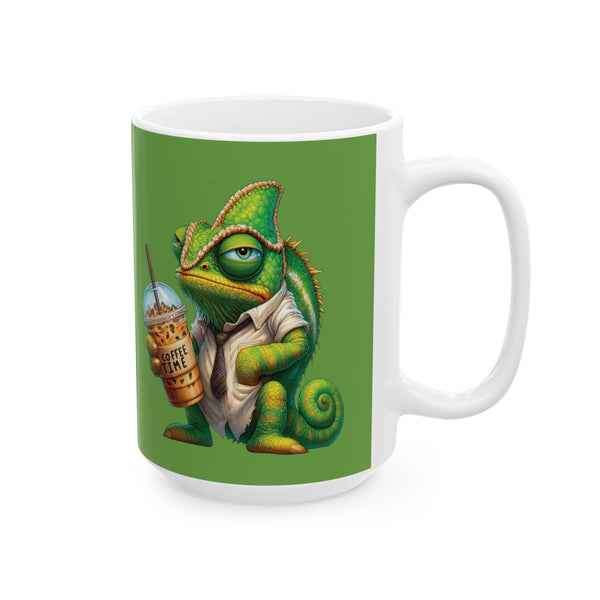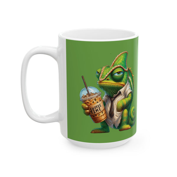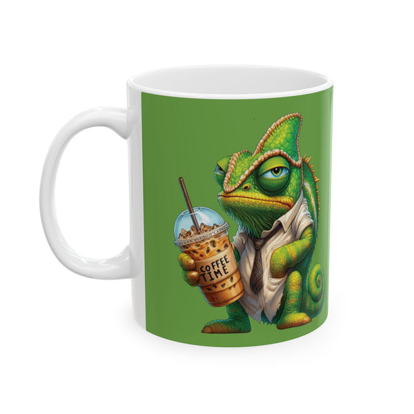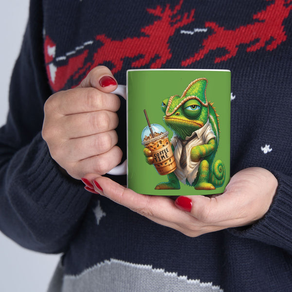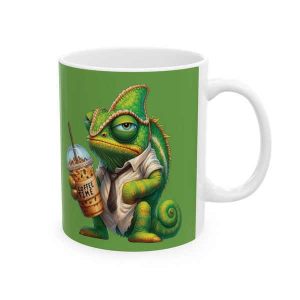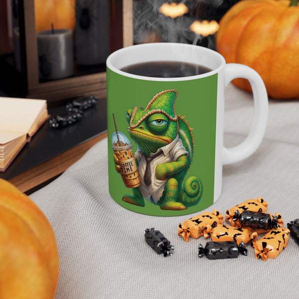 Bring some grumpy charm to your mornings with this quirky chameleon mug — because coffee always comes first!