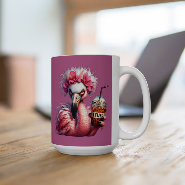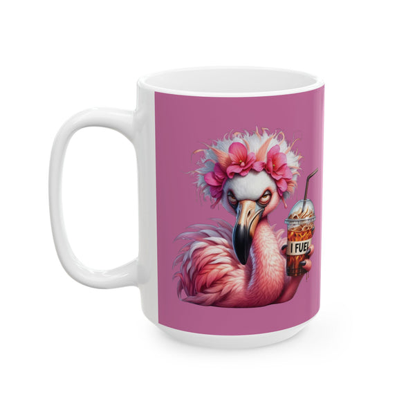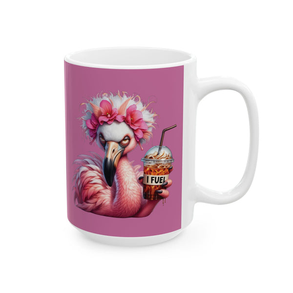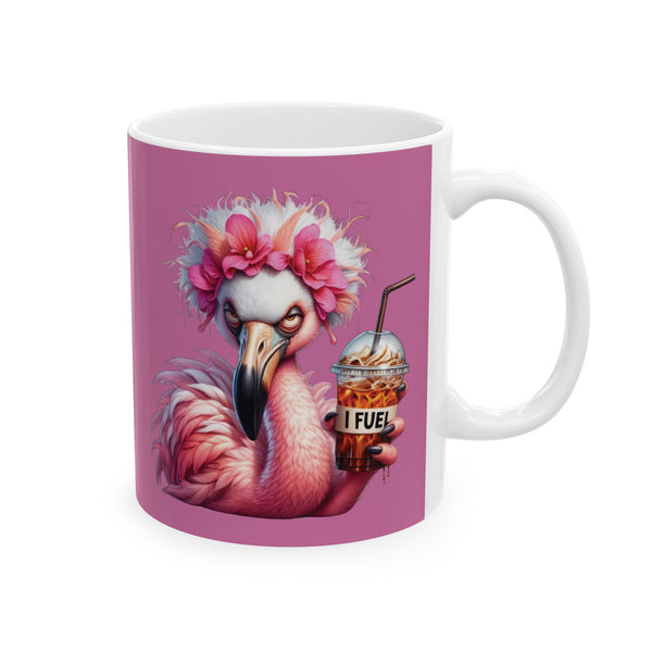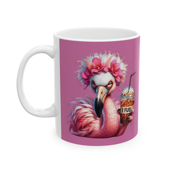 Add a splash of sass to your mornings! This Funny Grumpy Flamingo Coffee Mug features a feisty flamingo wearing a floral crown and holding an iced coffee labeled “I Fuel.” Perfect for coffee lovers who run on caffeine and attitude.