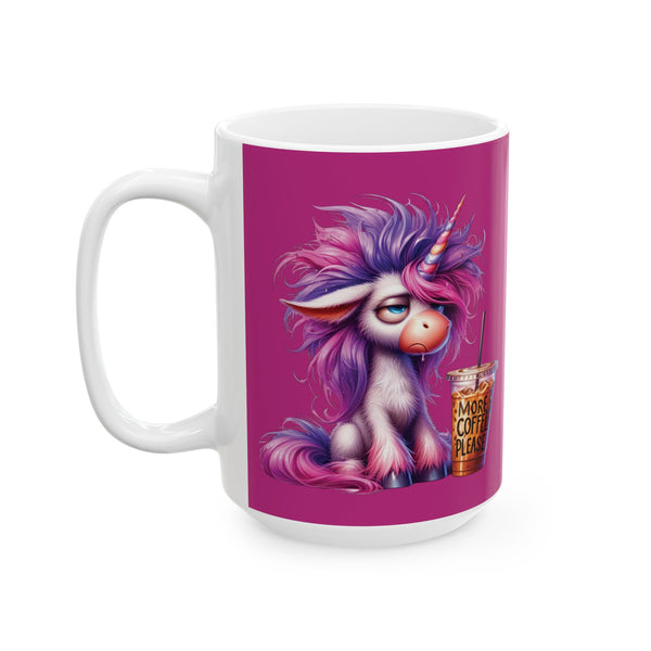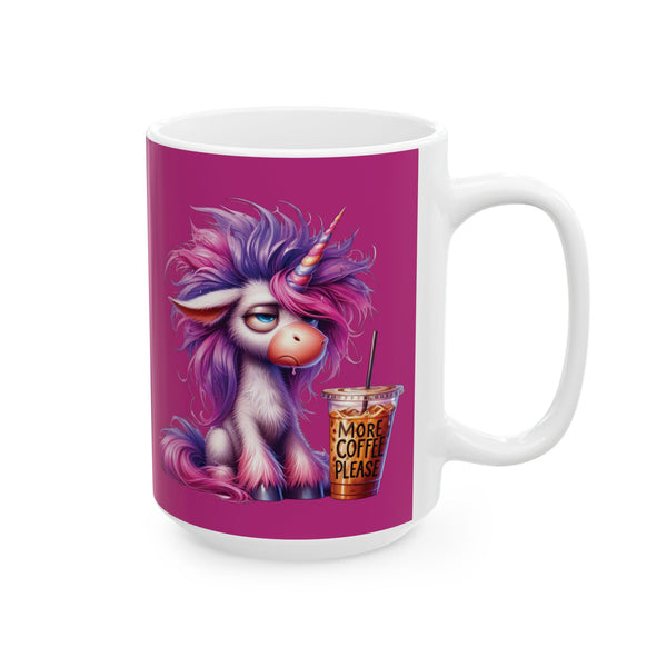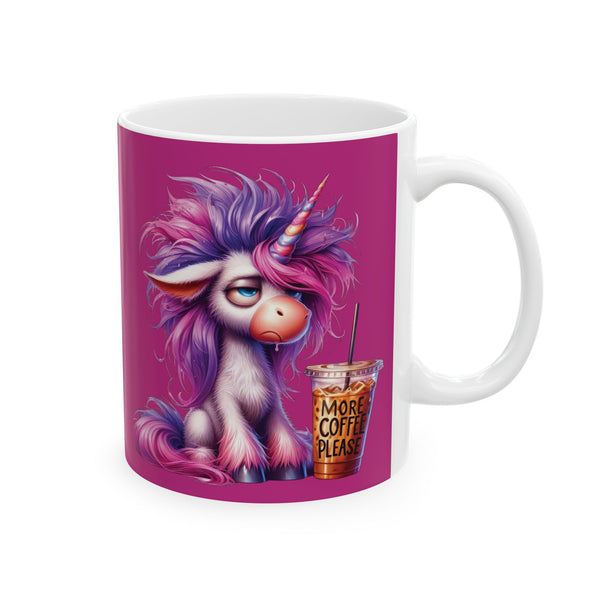 Add a touch of magical attitude to your mornings! This Funny Grumpy Unicorn Coffee Mug features a sleepy, wild-haired unicorn holding a cup labeled “More Coffee Please.” Perfect for anyone who needs a little extra magic (and caffeine) to start the day.