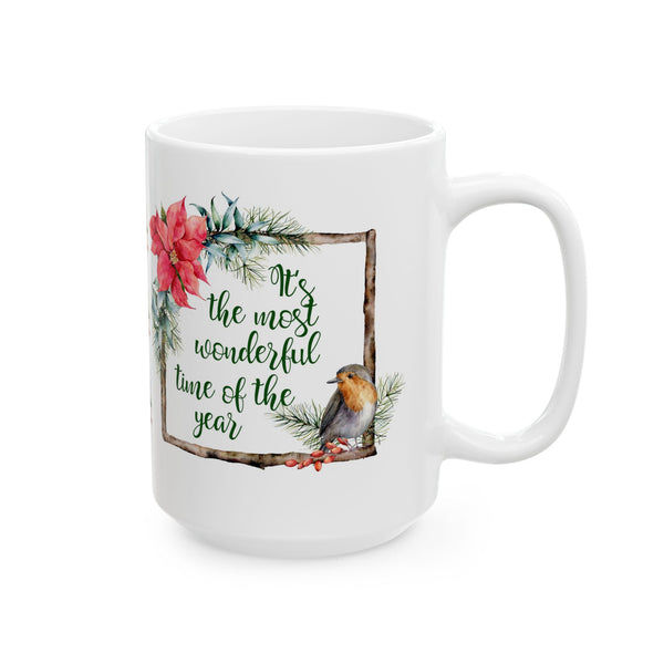 Bring holiday cheer to your mornings with this festive Christmas coffee mug. Featuring the joyful phrase “It’s the most wonderful time of the year” framed with poinsettias, pine sprigs, and a sweet robin, this ceramic cup is perfect for cozy winter drinks. Available in both 11 oz and 15 oz sizes, it’s ideal for coffee, tea, or hot cocoa by the fire.
