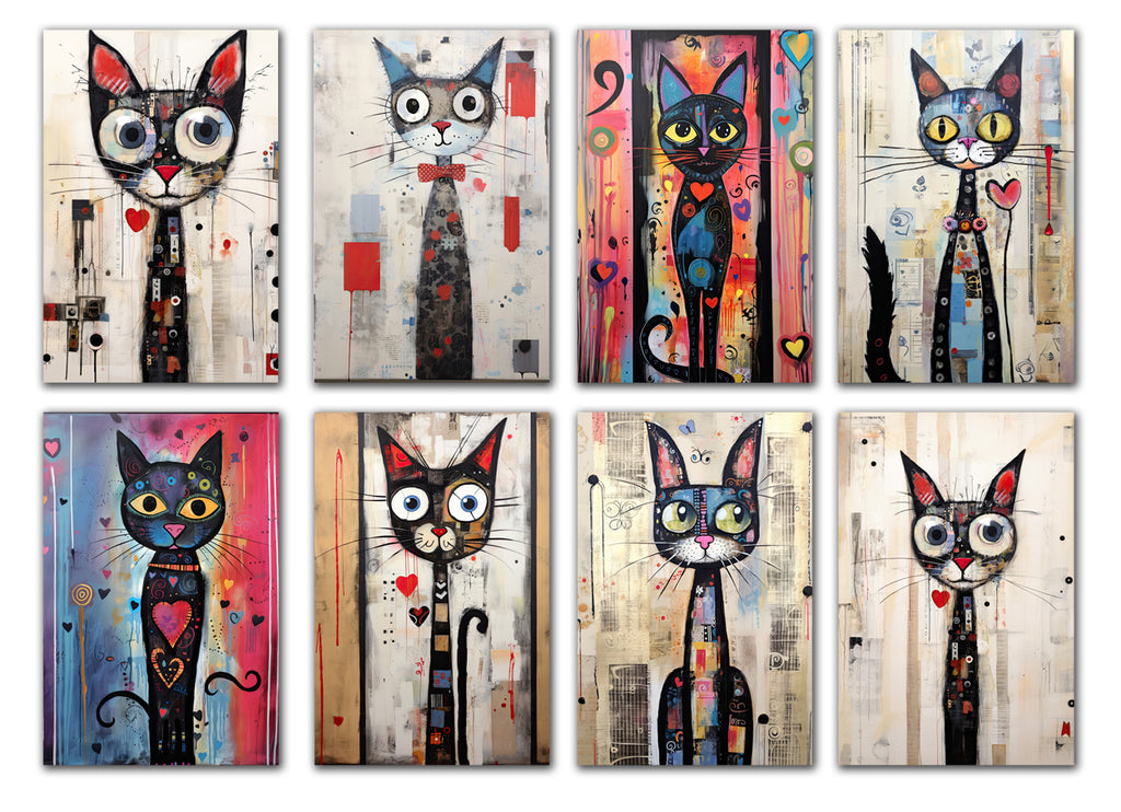 8 Handmade Whimsical Cats – Blank Inside – Folded 4x6 Every Occasion Cards with White Envelopes
