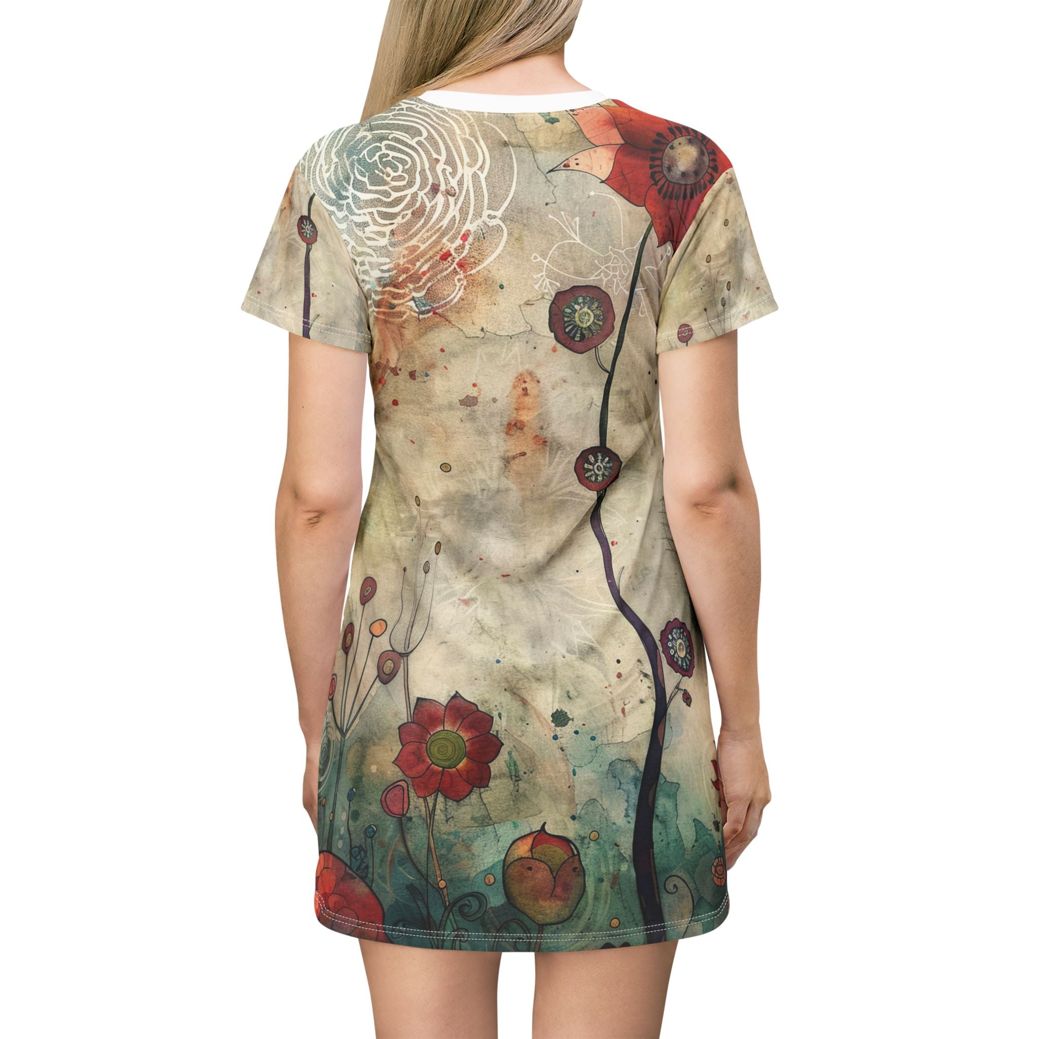 Bohemian Floral T-Shirt Dress, Casual Summer Red Poppy Abstract Retro