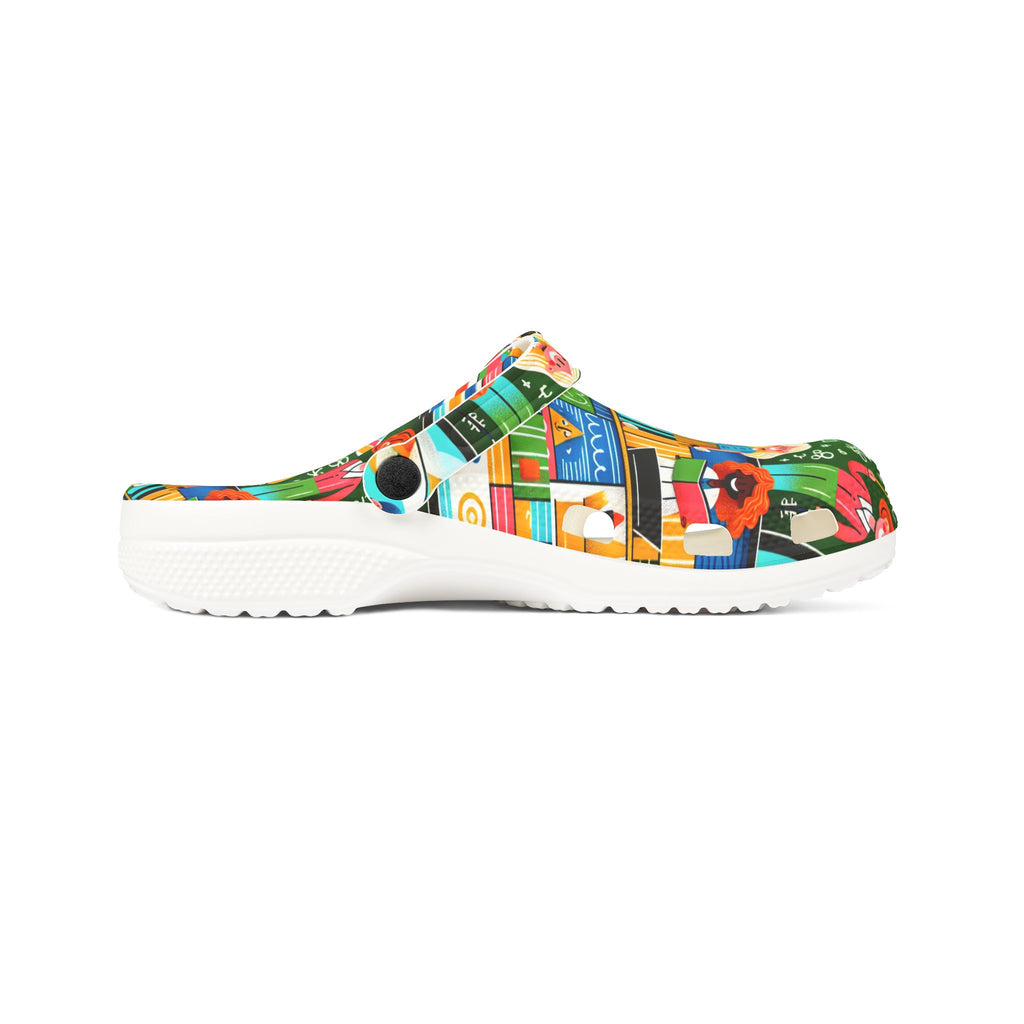 Colorful and comfortable teacher clogs featuring blackboard, crayons, chalk, letters, and numbers. Perfect for teachers, educators, and school staff. Ideal for back-to-school season and Teacher Appreciation Day.