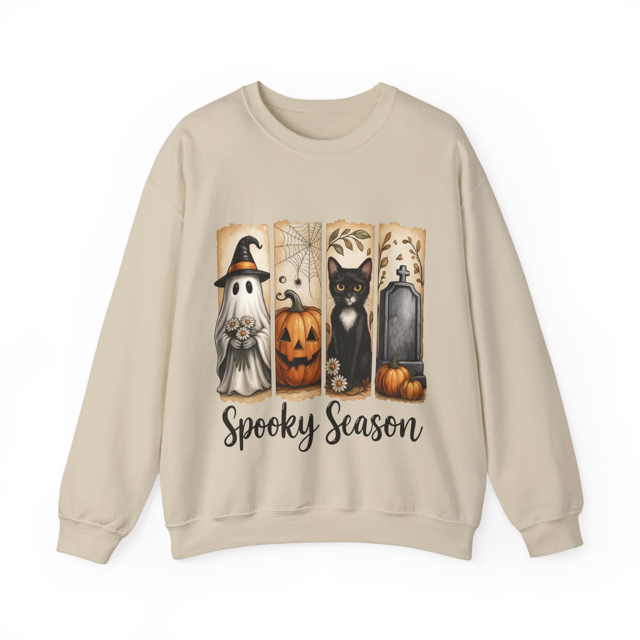 Beige sweatshirt with Halloween-themed design featuring ghost, pumpkin, cat, and tombstone on a white background.