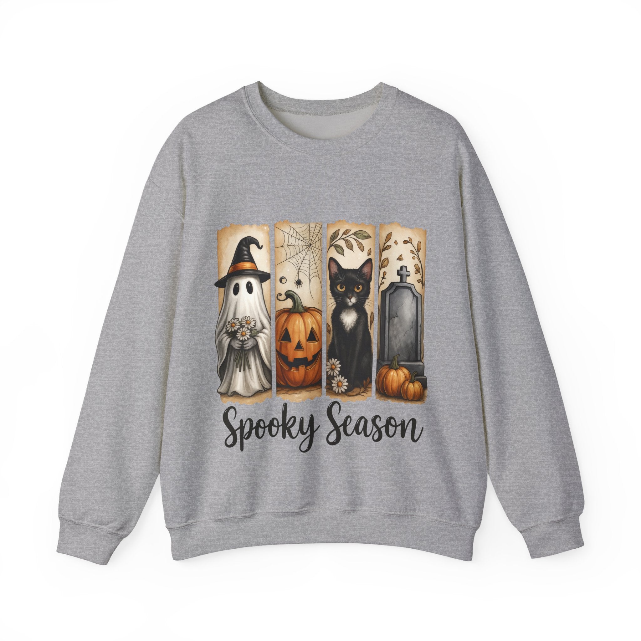 Gray sweatshirt with Halloween-themed design featuring a ghost, pumpkin, black cat, and tombstone on a white background.